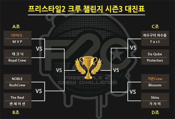 ... 16강 경기는 토너먼트 방식으로 진행되며, A, B조 경기에서는'오피스'와 'MVP'를 비롯해'테크닉'과 '로얄크루', '노블', '러시크루', '더리얼', '센세이션' 등이 출전한다. 조영석 '프리스타일2' 사업부장은 "이번 시즌에는 실력파 크루들의 참여가 높아 수준 높