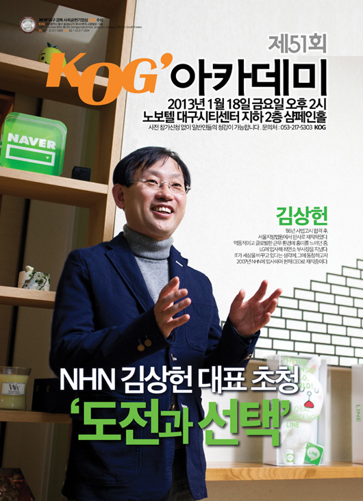 ... 그랜드체이스와 엘소드, 파이터스클럽으로 해외서 인기를 모으고 있는 KOG는 자사가 주최하는 '51회 KOG 아카데미'에 NHN 김상헌 대표를 초빙한다고 밝혔다. 'KOG 강연회'는 대구지역 젊은이들에게 유명인사와 만남의 기회를 제공한다는 목적으로 2007년 3월부터 5년
