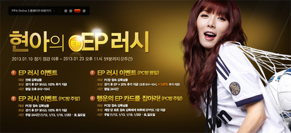 ... 평일에는 경기 후 지급되는 EP를20% 추가 지급하고 주말에는 최초 접속 시 행운의 EP 카드가 증정되고추가 EP를 100%만큼 획득할 수 있다. 이와 함께 접속 평일 20시부터 22시에 플레이하는 모든 유저에게 100% 추가 EP를 제공되고 해당 시간에 가맹점 PC방에서 접속