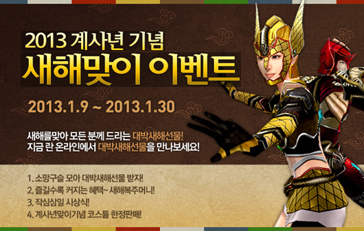 ... 또 몬스터 사냥으로 얻을 수 있는 재료를 조합해 신년 떡국 아이템을 완성한 이용자에게도 상품을 증정한다. 라이브플렉스는 아란전기 이용자가 원하는 선물을 지급하는 이벤트를 진행한다. 게임 내 소원나무 퀘스트를 수행한 이용자 중 60명을 선정해 최대 30만원 상당의 소원 상품을