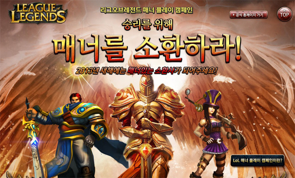 ... 이번 캠페인은 1월 10일부터 4주 동안 리그 오브 레전드 홈페이지 내 별도 캠페인 페이지에서 진행된다. 특히 캠페인 기간 동안 인기 웹툰 작가들도 매너 플레이와 관련된 웹툰을 릴레이 형태로 연재할 계획이며, 플레이어들로부터 많은 호응이 예상된다. 캠페인 첫 2주 동안은 인기