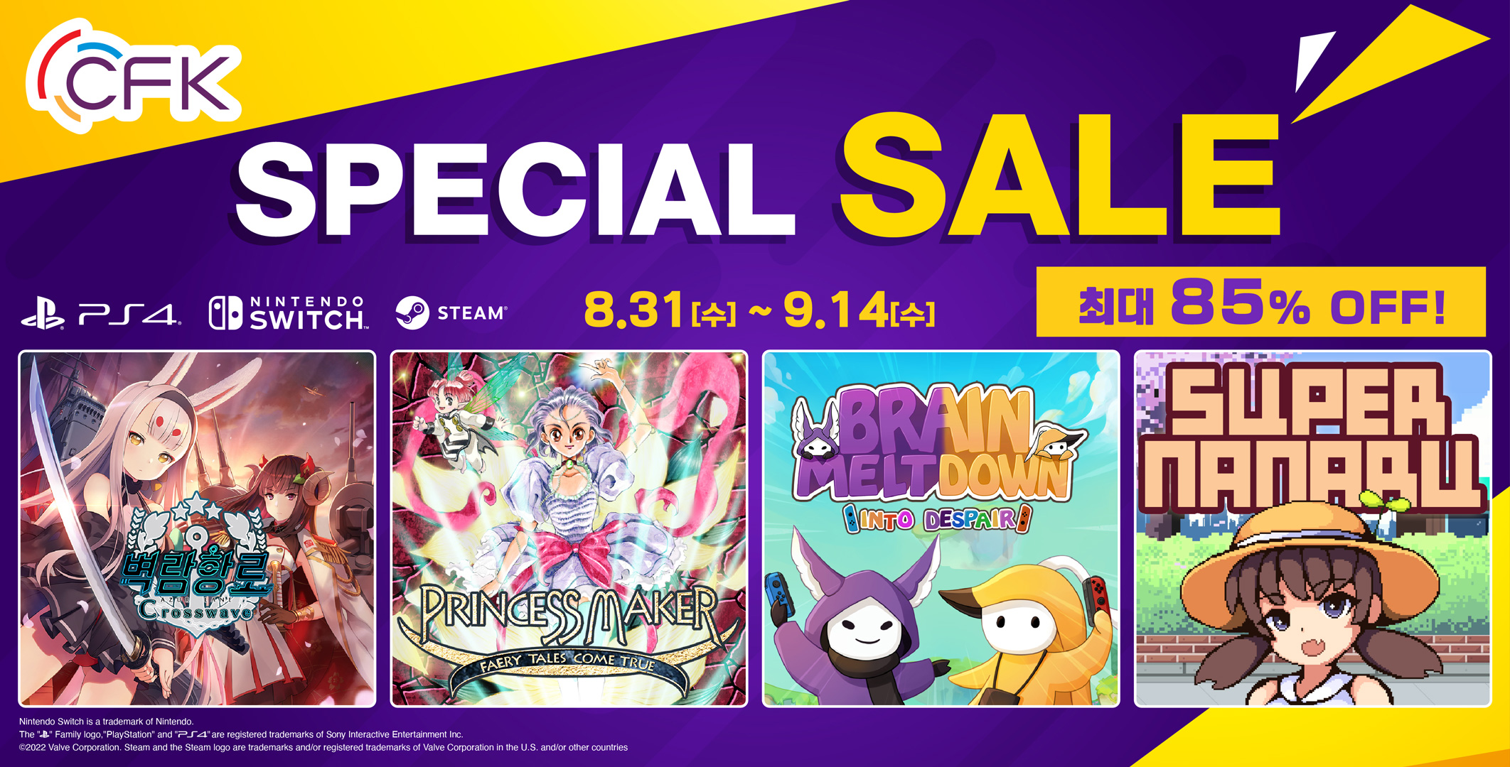 ... [자료제공 = CFK] 게임 퍼블리셔 CFK는 2022년 추석을 맞이하여 PlayStation™Store와 닌텐도 e숍, 스팀 스토어에서 특별 세일이 진행된다고 발표하며, 「프린세스 메이커 -꿈꾸는 요정-」, 「호텔 소울즈」, 「슈퍼 나나루」 등 인기 타이틀의 할
