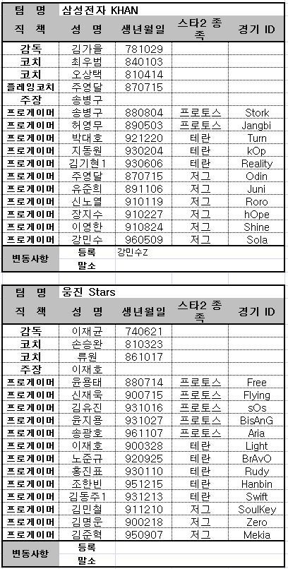 ... 또 SK텔레콤과 제8게임단이 각각 최호선과 후안 로페즈를 등록하며 테란 종족에 힘을 보탰다. 이번 로스터는 오는 5일 2라운드부터 적용되며 29일까지 유효하다. ◆ SK플래닛 스타크래프트2 프로리그 12-13 시즌 1월 로스터 [오상직 기자 sjoh@chosun