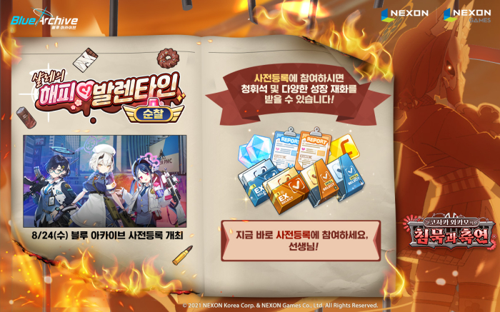 ... 사전등록 완료 시 선택한 학생의 커스텀 팝업을 받으며, 참여한 모든 이용자에게 9월 6일 업데이트 이후 보상으로 최대 ‘청휘석 2,400개’를 지급한다. 특히 사전등록 50만회 달성 시에는 추첨 통해 수제 초콜릿 및 초콜릿 몰드를 선물한다. 이와 함