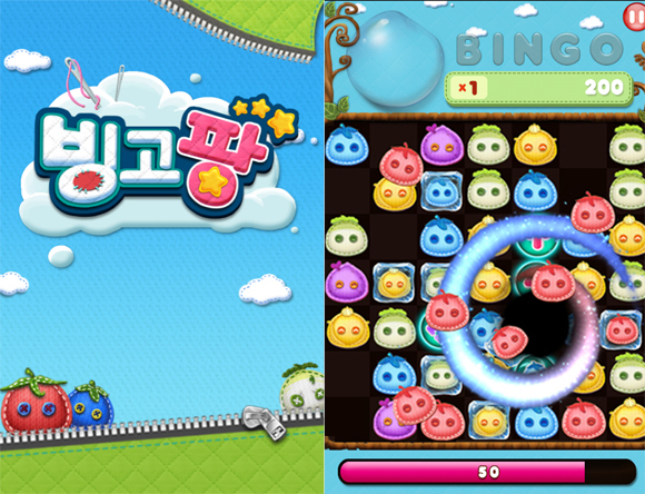 ... 빙고팡은 야채 봉제 인형 형태의 같은 색 블록을 손가락으로 밀어 클리어 시키는 게임으로 누구나 쉽게 즐길 수 있다. 특히,가로와 세로 방향의 블록을 모두 터뜨릴 수 있는 물폭탄 아이템을 비롯해 화살표 방향의 모든 블록을 제거하는 화살표 아이템 등을 전략적으로사용할 수 있