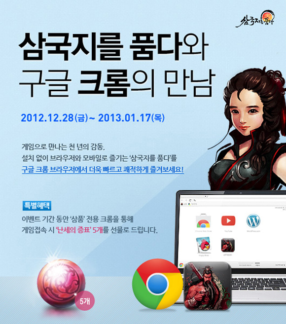 ... 넥슨 김재한 마케팅팀장은 “별도의 설치 없이 웹 브라우저에서 즐기는 ‘삼국지를품다’를 크롬 웹 브라우저에서 더욱 빠르고 쾌적하게 즐길 수 있도록 하기 위해 이번 프로모션을 진행하게 됐다”며 “앞으로도 다양한 플랫폼과 환경에서 쾌적하게 게임을 즐길 수 있도록 브라우저 환경지원
