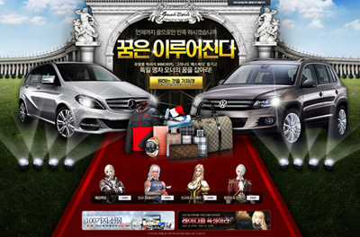 ... 특히 이용자는 출석체크 경품으로 ‘버버리 향수’와 ‘스와치 시계’ ‘루이비통 지갑’ ‘구찌 핸드백’과 ‘유럽 항공권’을 획득할 수 있으며 30일 이상 출석을 한 이용자에게 한빛소프트는 승용차 '벤츠 B클래스' 또는 '폭스바겐 SUV 티구안'을 증정한다. [이승진 기자 Lou