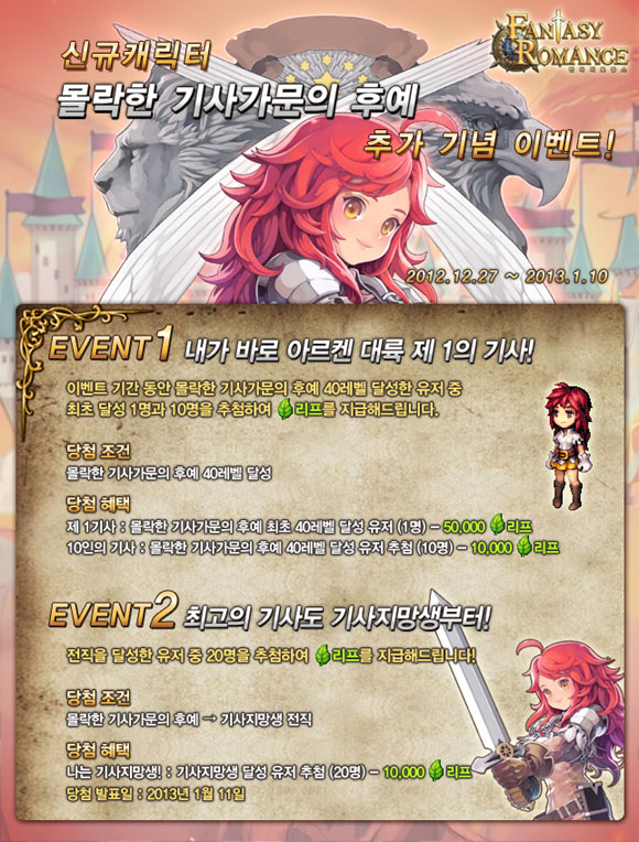 ...또한, 한손검과 투착, 방패 등을 사용하고 양손을 활용한 공격기술도 가능하며 2차 전직으로는 기사지망생으로 전직할 수 있다. 판타지로망스는 신규 캐릭터 추가와 함께 1월 중 신규 도시 3개를 새롭게 오픈하고 최대레벨을 40에서 60으로 확장할 계획이며 2월에는 열등생, 3월에는 떠