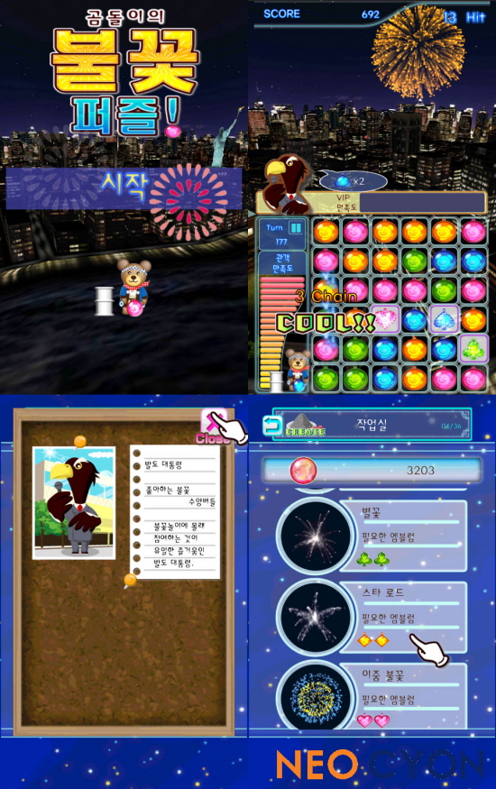 ... 같은 색의 화약을 3개 이상 모아 터뜨리면 풀 3D로 구성된 야경 위로 총 40가지의 불꽃들이 수놓아진다. 특히 관객의 환호도가 높을수록 화약 구매에 필요한 포인트를 많이 획득할 수 있으며, 만족도에 따라 대통령부터 유명 배우까지 다양한 직업을 가진 VIP 손님들이 등장한다