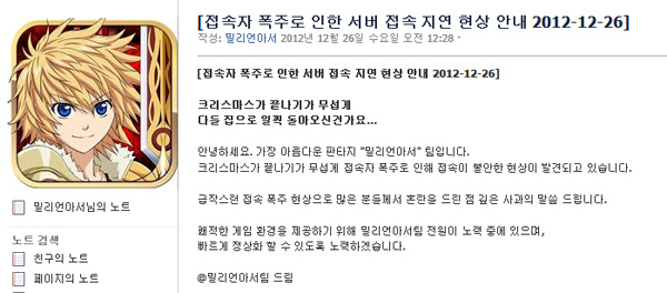... 출시 하루가 채 되지 못한 첫날 접속 폭주로 서버를 2배 증설했던 밀리언아서는크리스마스가 지나자 다시 유저가 몰리면서 접속 장애가 잇따르고 있다. 특히 밤 11시부터 새벽 1시까지와 크리스마스가 지난 이후 서버 불안정 문제가 발생한 것. 액토즈소프트는 "지속적으로 서버를