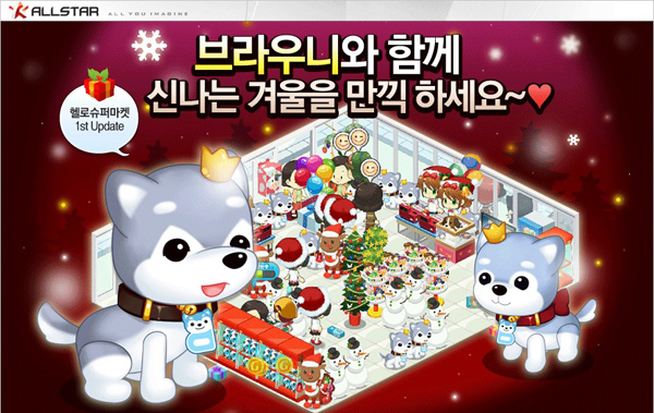 ... 이번 라이선스 계약으로 헬로슈퍼마켓에는 개그콘서트의 인기 코너 정여사에 출연해 높은 인기를 얻고 있는 강아지 인형 브라우니가 추가돼 유저들은 브라우니를 슈퍼마켓의 파트 타이머로 고용하거나 친구들에게 선물할 수 있게 됐다. 이와 함께 크리스마스 분위기로 슈퍼마켓을 꾸밀 수 있