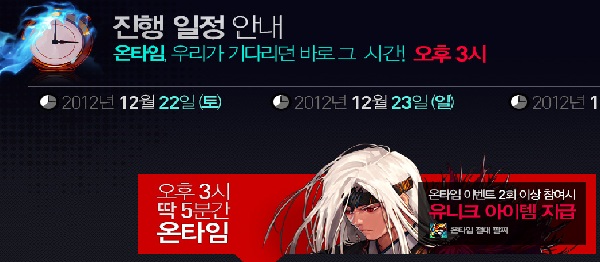 ...이로인해 23일 던파 접속이 원활하지 않아 포털 실시간 검색어에 오르고, 정상적으로 플레이하려는 유저의 접속도 힘들 정도로 많은 참여가 이뤄지고 있다. 던파는 2012 온타임 이벤트 시즌3의 슬로건인 '오후 3시를 지배하는 자'와 같이 던파 유저들의 접속을 이끌어내고 실시간 검색어