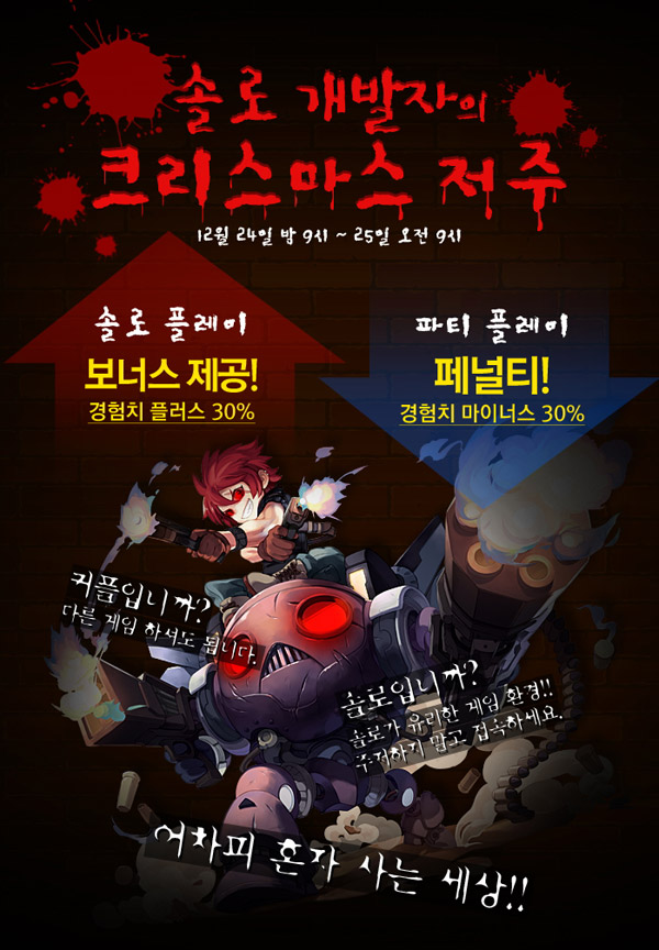 ... 텐비익스트림은 우선 크리스마스를 기념해 24일 밤 9시부터 25일 아침 9시까지 크리스마스에 솔로로 지내야하는 개발자의 애환을 담아 솔로 플레이하는 유저에게 30%의 추가 경험치를 지급하고 반대로 파티 플레이를 하는 유저에게 30%의 페널티 경험치를 주는 솔로 개발자의 저주 이