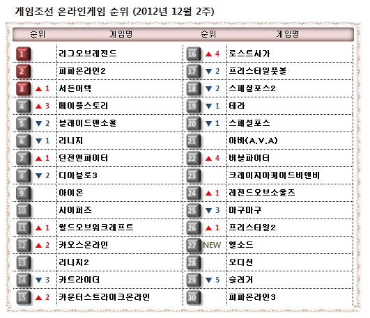... 웹보드 게임과 웹브라우징 게임은 제외된 리스트입니다. 12월 2번째 주(12월10일 ~ 12월16일) 온라인게임 순위입니다. 지난 18일 '피파온라인2' 정통 후계작 '피파온라인3'가 공개시범서비스를 시작한 가운데 각 게임사들은 이벤트와 업데이트로 겨울 게임시장 공략