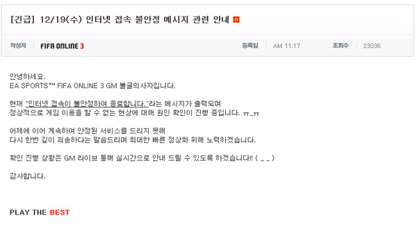 ... 이에 넥슨은 피파온라인3 공식홈페이지를 통해 "현재 '인터넷 접속이 불안정하여 종료합니다'라는 메시지가 출력되며 정상적인 게임을 이용할 수 없는 현상에 대해 원인 확인 중이다"라고 공지했다. 피파3는 지난 18일 정식 오픈 이후 각종 포털 검색어 상위권에 오르며 스포츠 게임