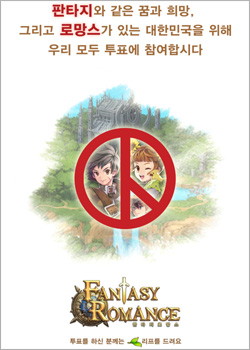 ... 판타지로망스 페이스북에 게시된 '판타지로망스 투표 독려 이벤트' 포스터를 자신의 페이스북으로 가져가고 대통령 선거 투표 인증샷을 올린 후 페이스북 메시지 보내기를 이용해 판타지로망스 페이스북에 자신의 판타지로망스 ID를 남기는 방식. 이벤트에 참여한 모든 유저에게는 3천