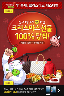 ...JCE(대표 송인수)는 넥슨(대표 서민)과 공동 개발하고 자사가 퍼블리싱하는 소셜게임 '메이플스토리 빌리지'의 크리스마스 이벤트를 17일부터 실시한다고 밝혔다. 먼저, 지정된 이벤트 페이지를 통해 3명의 카카오톡 친구에게 '메이플스토리 빌리지' 초대 메시지를 보내면, 추첨을 통