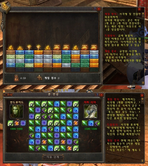 ... 우선 티르팡은 모바일 게임 애니팡과 유사한 형태의 미니게임이다. 하지만 단순히 그림만 맞추는 형태가 아닌 MMORPG에 등장하는 공격 또는 회복 스킬들로 블럭을 구성해 해당 효과로 대결을 펼치는 형태로 NPC나 유저와 1대1 대전해 보상으로 명예치를 획득가능하다. 벽돌깨기