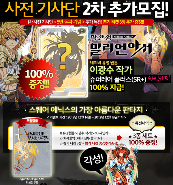 ...액토즈소프트(대표 전동해)는 스퀘어에닉스의 모바일 카드배틀 게임 밀리언아서의 2차 사전 등록 이벤트를 14일부터 시작한다고 밝혔다. 지난 17일부터 시작된 1차 사전 등록 건수가 5만 건을 돌파했다고 밝힌 액토즈소프트는 "뜻밖의 성원을 보내주신 유저들에게 감사하는 마음을 전한다