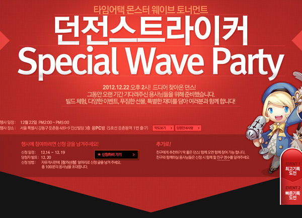 ... 먼저 내년 1월 9일까지 기간 내 게임 접속으로 획득하는 응모권을 아이패드 미니, 문화상품권, 게임 레어 아이템에 응모할 수 있는 응모 이벤트와 몬스터 사냥으로 획득하는 히어로즈 카드를 모아 NPC 토마에게 보물상자로 교환하는 이벤트가 진행된다. 다음으로 2월 6일까지 모든