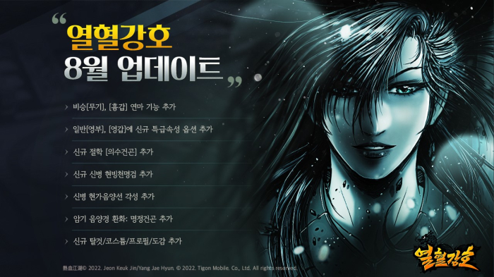 ... 비승 5레벨에 오픈되어 장비의 속성을 대폭 상승시키고 추가로 특수한 효과를 얻을 수 있다. 비승 장비와 함께 일반 영부와 영갑 부위에 특급속성 용정과 봉금 옵션이 추가되어 유저들의 기대감을 불러 일으켰다. 이외에도 이번 업데이트에서는 신규 절학 ‘의수건곤
