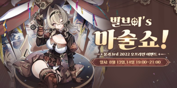 ...9 버전 업데이트를 기념하여 마술 오프라인 이벤트 ‘빌브이’s 마술쇼!’를 진행한다고 8일 밝혔다. 오는 11일 업데이트 예정인 5. 9 버전에서는 천재 마술사이면서 스팀펑크 스타일의 대포를 이용해 강한 공격력을 자랑하는 신규 S급 캐릭터 빌