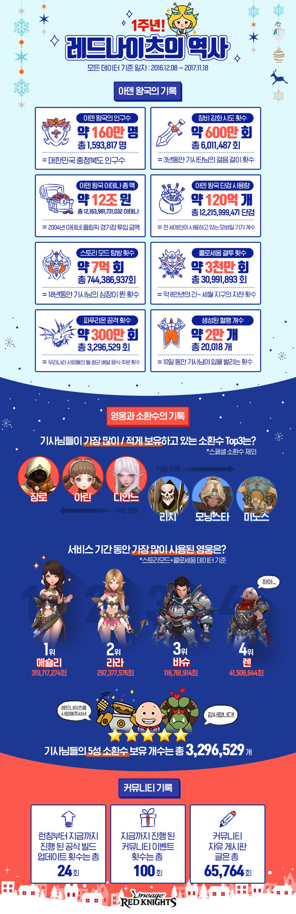 ... 1시간 쿨타임이 적용된다. 플레이 시간에 따라 많은 상자를 받을 수 있다. 이용자들은 서비스 1주년을 기념해 만든 영웅과 소환수의 새로운 코스튬(의상)을 만나볼 수 있다