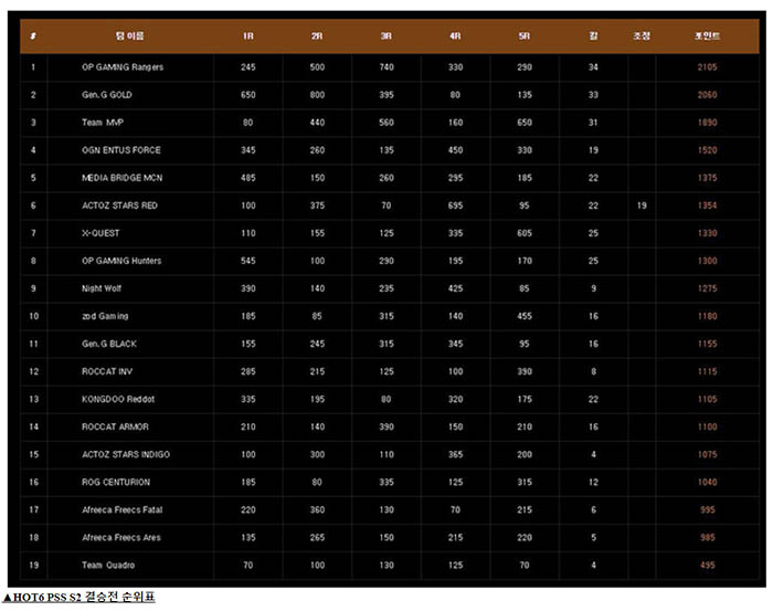 ... 종합우승은 5라운드에서 OP게이밍 레인저스가 2105점으로 GEN. G골드를 45점 차로 역전시키며 차지했다. 결승전 경기 이후 시상식에서는 핫식스 PSS S2 우승팀 OP 게이밍 레인저스가 상금 5000만원을 받았고 MVP로 선정된 우승팀의 최성철(BBABBO)