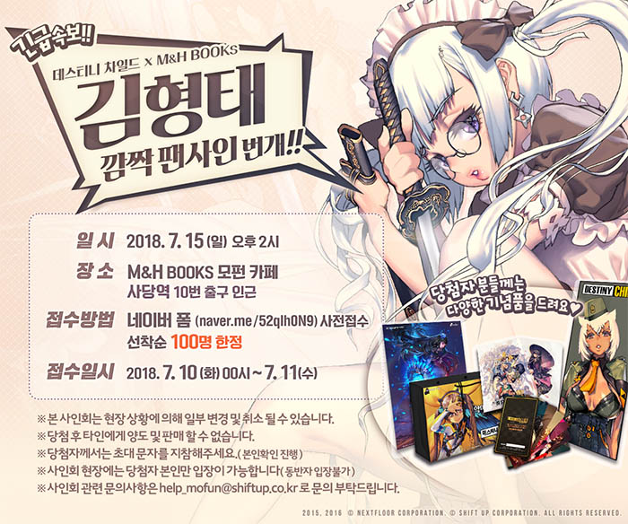 ... 팬사인회 참석자 전원에게는 김형태 대표의 친필 사인과 모나의 이미지가 적용된 기념 타올, 1000크리스탈 쿠폰 등이 제공된다. 김형태 시프트업 대표는 “‘그동안 계속 진행하고 싶었던 이벤트를 이제서야 어러분과 함께 진행하게 되어 기쁘다” 라며 “이번 콜라보을 시작