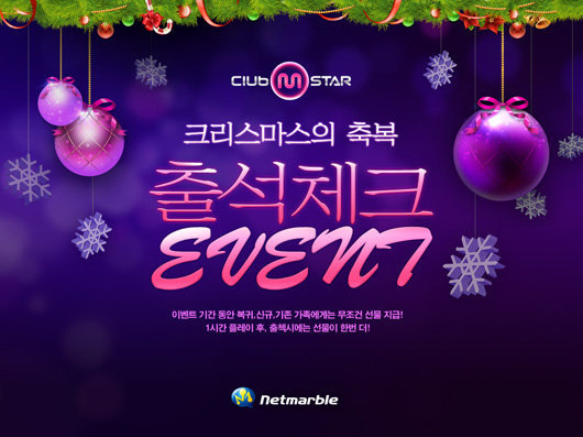 ... 먼저 넷마블은 12월6일부터 내년 1월3일까지 '클럽엠스타' 홈페이지를 방문하는 이용자에게 룰렛 이벤트에 참여할 수 있는 양말 주머니를 매일 3개 지급한다. 또 넷마블은 '출석체크' 이벤트로 모든 이용자에게 '신발 아이템' 교환권을 지급한다. 여기에 신규 및 복귀 이용자