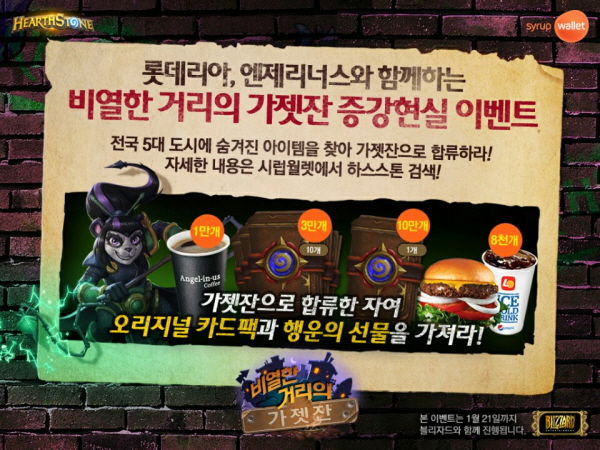 ...숨겨져 있는 아이템을 획득하면 오리지널 카드 팩 1개를, 숨겨진 아이템을 모두 획득하면 이벤트 기간 종료 이후 추첨을 통해 오리지널 카드 팩 10개를 받을 수 있으며, 최근 하스스톤 플레이 기록이 있을 경우 이벤트 당첨 확률은 더 높아진다. 또한 아이템을 획득하지 못한 사람들에게도