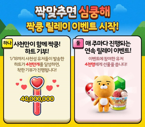 ...기부금은 무연고아동의 생계비, 치료비 등에 사용될 예정이며 보다 자세한 사항은 같이가치 페이지를 통해 확인할 수 있다. 이용자는 발송한 하트 수에 따라 다양한 인게임 아이템을 받을 수 있으며 전체 이용자들이 발송한 하트 수에 따라 다양한 보상 및 기부 여부가 결졍된다. 더불어 3