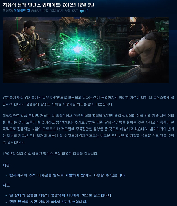 ... 이번 밸런스는 저그 종족의 마법 유닛인 감염충이 칼질을 당했다. 알 상태의 감염된 테란의 생명력이 100에서 70으로 감소했으며 진균 번식의 시전 거리가 9에서 8로 감소된 것. 반면 테란의 밤까마귀 유닛은 상향됐다