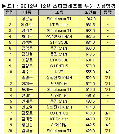 ... 한국e스포츠협회(회장 이형희)는 2012년 12월 스타크래프트 부문 프로게이머 공인랭킹을 30일 발표했다. 11월은 진행된 경기가 없었기 때문에 기간에 따른 점수 차감만 반영됐다. 정윤종(SK텔레콤, 프로토스)은 1344