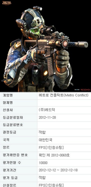 ...2차 비공개테스트를 앞두고 있는 FPS게임 '메트로컨플릭트'의 테스트 일정이 공개됐다. 3일 게임물등급위원회에 따르면 이 게임의 개발사 레드덕은 최근 '메트로컨플릭트' 테스트 버전에 대한 등급신청을 마치고, 오는 12일부터 18일 사이에 2차 비공개테스트를 진행할 예정이다.