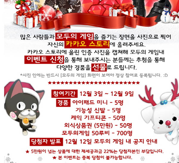 ..."모두의게임이 아이패드 미니 쏜다"핫독스튜디오(대표 성영익)에서 개발한 스마트폰용게임 '모두의게임'이 크리스마스를 맞이해 아이패드미니와 외식상품권 등을 제공하는 이벤트를 진행한다. 이번 이벤트는 지인들과 모두의게임을 즐기는 장면을 찍어 소셜네트워크서비스인 카카오스토리에 올린 뒤 인