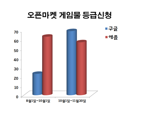 ... 게임물등급위원회(이하 게등위)에 따르면 지난 8월1일부터 10월1일까지 애플 앱스토어 출시를 위해 등급분류 신청한 게임은 총 63개로 집계됐다. 같은 기간 구글 플레이는 이보다 3배가량 적은 23건에 그쳤다. 그러나 10월을 기점으로 상황이 역전됐다