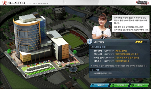 ... 풋볼매니저온라인이 이례적으로 CBT 중에 업데이트한 구단시설은 기존 감독 위주의 플레이에서 확장해 경기장, 스카우트실, 의료실, 훈련시설, 유소년 육성센터 등의 다양한 구단시설을 통해 세밀하고 전략적인 구단 운영을 가능하게 한다. 구단시설 메뉴를 통해경기장 업그레이드하면 관