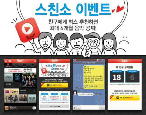 ... 카카오톡을 통해 음악을 추천한 친구가 벅스 앱을 설치하고 로그인하는 방식으로 진행되며, 이벤트에 참여한 친구 수에 따라 최단 일주일부터 최장 6개월까지 벅스에서 무료로 음악을 감상할 수 있는 쿠폰을 지급한다. 스친소 이벤트는 10만명에게 ‘듣기 7일 이용권’이 지급될 경우
