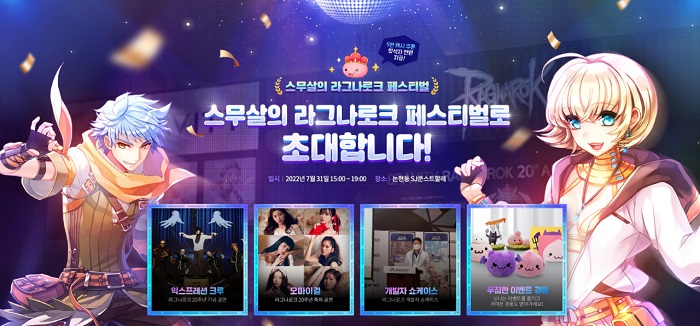 ... 행사장에서는 다양한 이벤트와 즐길 거리로 유저들을 맞이하며 라그나로크 포탈 이펙트, 조형물 전시, 라그나로크 BGM 라이브 연주 등을 통해 유저들이 입장과 동시에 라그나로크 게임 속에 들어온 것 같은 느낌을 받을 수 있을 것으로 예상한다. 라그나로크 20주년 기념 행사는