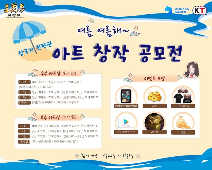 ... 개인, 동맹 출정, 장수 콩트 등의 작가 부문, N컷 만화, 단편 삽화, 이모티콘, 프로필 등의 화가 부문에 게임 관련 창작물을 만들어 참여할 수 있으며, 입상자에게는 풍성한 선물이 제공된다. 또한, 경우에 따라 ‘삼국지 전략판’ 공식 웹툰으로 제작되거나