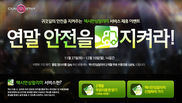 ... 한비즈컨버전스가 출시한 택시안심알리미 서비스는 택시 이용 시 GPS를 통해 이용자의 승하차 정보와 택시 위치 및 이동 경로를 보호자의 휴대폰으로 실시간 전송해 안전하게 이용할 수 있는 가족 안심서비스다. 넷마블 김기돈 본부장은 "클럽 엠스타는 게임 내 재미추구 이외에도