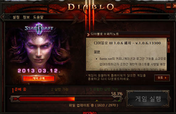 ...이번 패치는 특별한 시스템 업데이트가 아닌 버그 수정을 주요 골자로 한다. 향후 배틀넷에 추가될 예정인 케뮤니케이션과 로그인 기능과 관련된 데이터가 패치에 포함되고 거래창에서 거래 시간을 건너뛸 수 있던 버그와 야만용사의 '위협의외침' 기술이 동일한 아이템 얻게 하는 문제가 해결됐