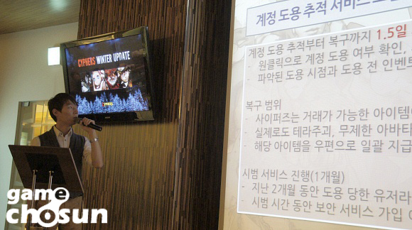 ... 이 시스템은 계정 도용으로 피해를 입은 이용자들을 위한 보안서비스로, 계정이 도용된 시점을 파악해 잃어버린 아이템을 복구해주는 것을 주요 골자로 하고 있다. 특히 계정도용 추적에서부터 복구까지 1. 5일이 소용되는 초고속 서비스를 진행하겠다는 게 회사 측 목표다