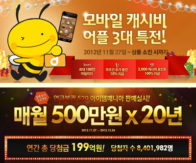 ... 또 회사 측은 캐시비 포인트로 자사 마일리지를 충전한 회원에게 선착순으로 추가 마일리지를 지급한다, 캐시비는 교통카드와 기타 상품 결제 기능을 포함한 다목적 선불카드다. 이와함께 아이템매니아는 마일리지로 ‘연금복권 520’을 구매할 수 있는 프로모션을 실시한다. ‘연금복