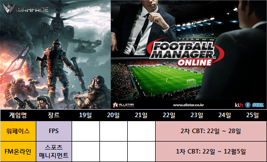 ... 이번 주 신작게임은 오는 22일에 두 작품이 공개됩니다. 악마의 패키지 게임이라 불리는 '풋볼매니저'의 온라인 버전 '풋볼매니저온라인(이하 FM온라인)'과 차세대 FPS로 불리는 '워페이스'가 주인공입니다. 당초 22일 테스트 예정됐던 호러 FPS '피어온라안'은 내달