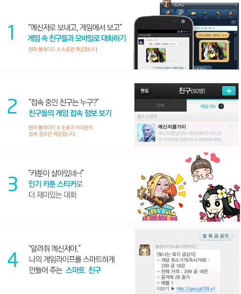 ... NC모바일은 이번 1. 2 업데이트로 ▲지금 접속 중인 친구를 실시간으로 확인할 수 있는 기능, ▲게임 공지와 아이템 정보나 시세, 이벤트 소식 등을 대화 형식으로 알려주는 스마느 친구, ▲게임 속 친구들과 스마트폰으로 대화를 나눌 수 있는 기능, ▲인기 카툰 스티커 추가까지
