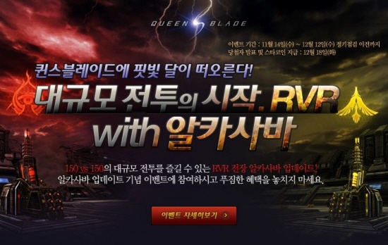 ... 일주일에 1회만 개방되며 30레벨 이상의 유저만 참여할 수 있다. 업데이트를 기념한 이벤트도 진행된다. 신규 콘텐츠를 즐긴 이용자에게는 퀸스블레이드 캐릭터 피규어와 문화상품권 등이 제공된다