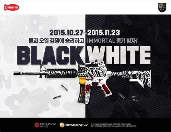 ...먼저 이벤트 페이지에서 블랙팀과 화이트팀 중 한 팀을 선택한 뒤 30분 플레이를 진행하면 물 1개를 지급하고 PC방에서 접속할 경우 오일 1개를 추가로 제공한다. 이용자는 이벤트 기간 동안 물 20개를 획득하면 선택한 팀에 해당하는 임모탈 시리즈 신규 총기 1개를 무조건 받을 수