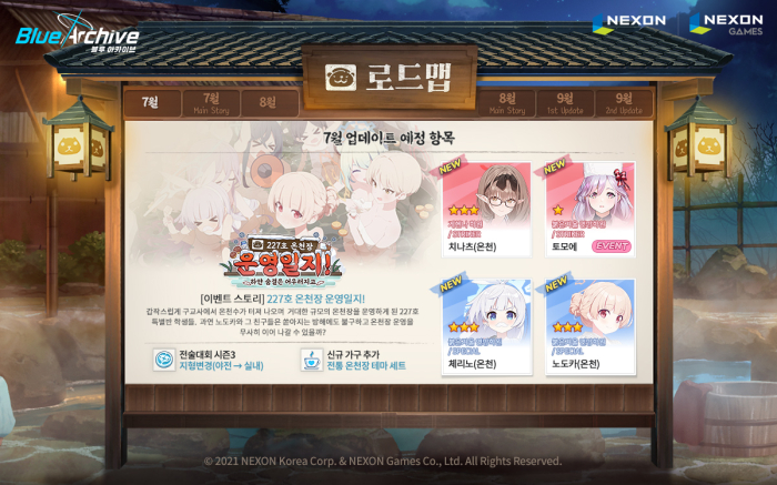 ... 7월 11일까지 공식 커뮤니티 내 사전등록 페이지에서 온천 입욕권을 제출하면 사전등록에 참여할 수 있고, 참여한 모든 이용자에게는 7월 12일 업데이트 이후 보상으로 인게임 재화 ‘청휘석 1,200개’를 선물한다. 같은 기간, 매일 게임에 접속하면 총
